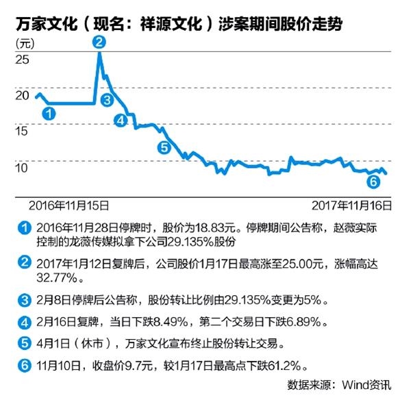 祥源文化去年底曾公告称,第一大股东万家集团拟将公司29.135%的股份转让给实际控制人为赵薇的龙薇传媒。但今年2月却公告称,股份转让比例由29.135%变更为5%。到了4月,双方又突然解除了这笔交易。