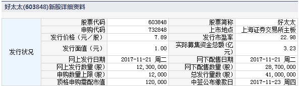 根据交易所公告,广东好太太科技集团股份有限公司于2017年11月21日进行网上和网下申购。本次公开发行股票总数量为4,100万股。回拨机制启动前,网下初始发行数量2,870万股,占本次发行总股数的70%;网上初始发行数量1,230万股, 占本次发行总股数的30%。