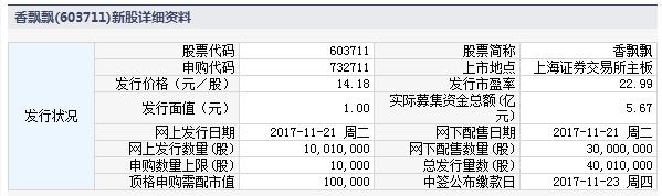 根据交易所公告,香飘飘食品股份有限公司于2017年11月21日进行网上和网下申购。本次发行股份数量为4,001万股,全部为新股,其中,网下初始发行数量为3,000万股,为本次发行数量的74.98%;网上初始发行数量为1,001万股,为本次发行数量的25.02%。
