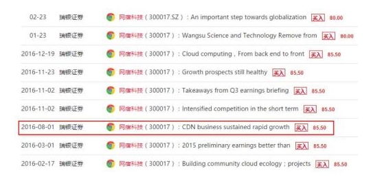 2016年7月28日(上图显示为收录时间),也就是网宿科技达到历史最高点(前复权)的当天。瑞银证券发表了一篇题为《CDN business sustained rapid growth》的研究报告,认为网宿科技业务持续高速成长,给出的目标价为85.5元。当日,网宿科技收盘价75.25元,这意味着瑞银认为网宿科技至少要上涨13%。