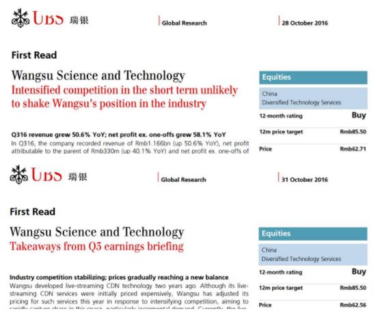 2016年10月28日和10月31日,瑞银连发两篇研报号召股民买入,认为短期内激烈的竞争不太可能动摇网宿科技在行业中的地位,给出的目标价为85.5元,目标涨幅为36%。