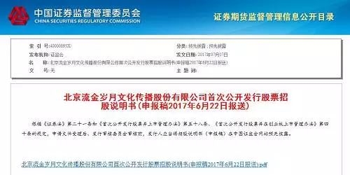 而证监会网站信息显示,流金岁月已经披露了招股说明书。流金岁月这家新三板公司很可能即将在A股上市。据流金岁月11月13日的公告显示,公司股票自 2017 年 7 月4 日起暂停转让,目前还在停牌中,而公司在中小板IPO的申请已经得到了证监会的受理。