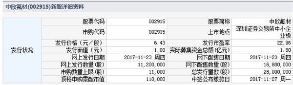 根据交易所公告,浙江中欣氟材股份有限公司于2017年11月23日进行网上和网下申购。本次发行股份数量为 2,800 万股。回拨机制启动前,网下初始发行数量为 1,680 万股,占本次发行数量的 60%;网上初始发行数量为 1,120 万股,占本次发行数量的 40%。