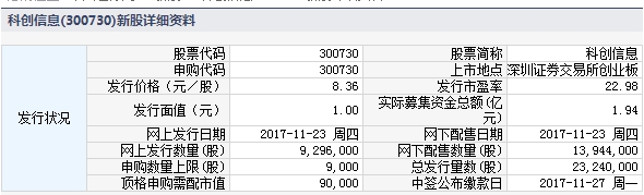 根据交易所公告,湖南科创信息技术股份有限公司于2017年11月23日进行网上和网下申购。本次公开发行股票总数量为 2,324 万股,全部为新股。回拨机制启动前,网下初始发行数量为 1,394.4 万股,占本次发行总股数的 60%;网上初始发行数量为 929.6 万股,占本次发行总股数的 40%。