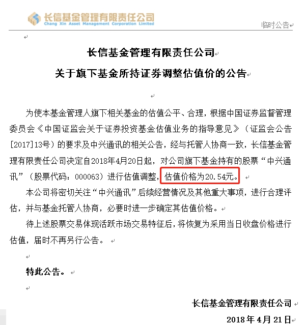 长信基金今日公告,自4月20日起,对公司旗下基金持有的股票“中兴通讯”(股票代码:000063)进行估值调整,估值价格为20.54元。 而就在3天前即4月18日,长信基金才公告表示自4月17日起,对公司旗下基金持有的中兴通讯进行估值调整,估值价格为25.36元。