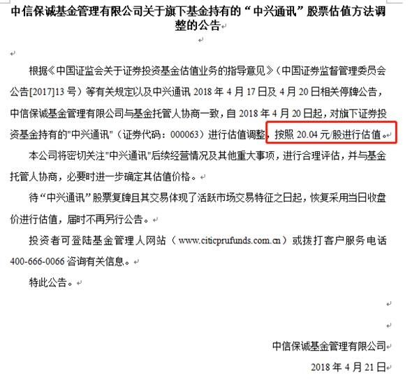 而由于美国的禁令,中兴通讯A股和H股自4月17日起停牌,作为600多只基金的持仓股乃至重仓股,停牌后中信保诚、长信等超过40家基金公司先后调整估值,普遍按停牌前31.31元收盘价的2个跌停25.36元/股或者下调20%即25.05元进行估值,也有前海开源基金按3个跌停即22.82元/股估值。