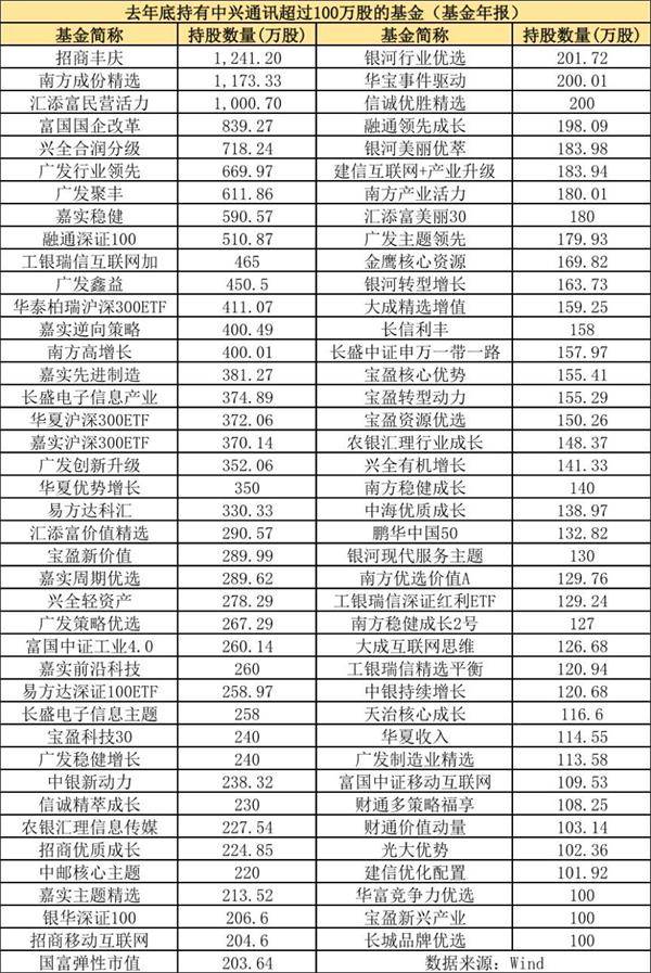 从持仓数量看,去年底有三只规模较大的基金持仓中兴通讯超过1000万股,分别为招商丰庆、南方成份精选和汇添富民营活力,富国国企改革、兴全合润分级、广发行业领先、广发聚丰、嘉实稳健、融通深证100等持股数量在500万股到900万股之间。大多数基金持股数量在100万股以下。