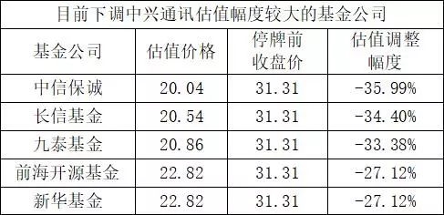 中兴通讯停牌前价格为31.31元,长信基金第一次调整估值价格相当于停牌前价格的两个跌停,而此次再度下调估值,20.54元的价格相当于停牌前价格的四个跌停,累计调整幅度达34.34%。