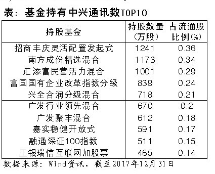 具体来看,招商丰庆2017年末持有中兴通讯1241万股,占流通股比例达0.36%,虽然与2017年三季度相比减持了289万股,但仍然在去年末是所有基金中持股数量最高的。此外,南方成份精选、汇添富民营活力、富国中证国有企业改革指数分级、兴全合润分级混合基金等660只基金均持有中兴通讯,一旦中兴复牌,所受影响大小不一(见表)。值得一提的是,从爆款基金兴全合宜此前发布的上市公告书看,其持有中兴通讯高达2509.6万股,位于十大重仓股行列。