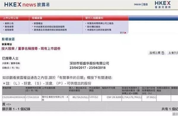 而这一猜测在4月23日获得了港交所文件的证实!4月23日盘后港交所披露,宝能旗下的钜盛华在4月17日减持了8972万股万科A股,减持均价29.92元/股。这也证实了此前市场对4月17日发生在万科A上的两笔大宗交易系宝能所为的猜测。