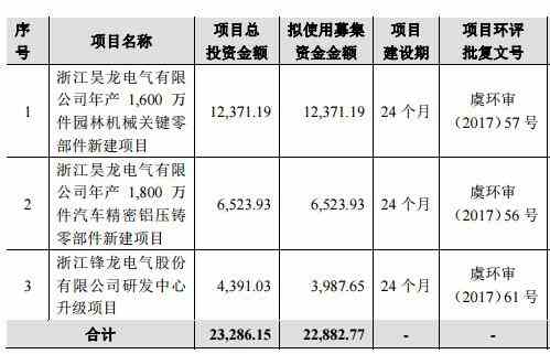 招股书显示,锋龙电气此次募资投向为:浙江昊龙电气有限公司年产 1,600 万件园林机械关键零部件新建项目;浙江昊龙电气有限公司年产 1,800 万件汽车精密铝压铸零部件新建项目;浙江锋龙电气股份有限公司研发中心升级项目。
