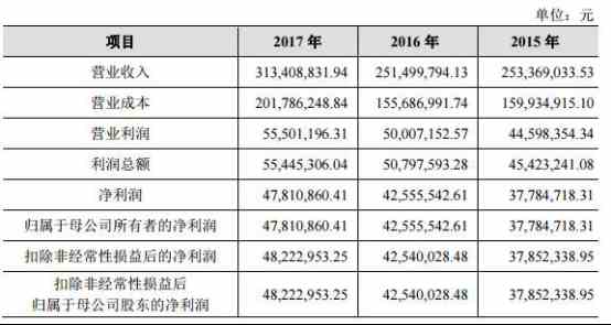 2015年、2016年、2017年,锋龙电气营业收入分别为2.53亿元、2.51亿元、3.13亿元;归属于母公司所有者的净利润分别为3778.47万元、4255.55万元、4781.09万元。