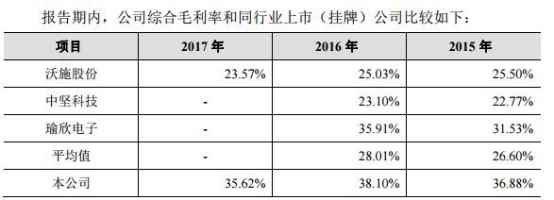 锋龙电气2015年至2017年综合毛利率分别为36.88%、38.10%、35.62%,高于同行业上市(挂牌)公司。
