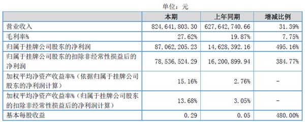 惠云钛业发布2017年度业绩报告,报告显示公司营业总收入824,641,803.30元,同比增长31.39%,归属于挂牌公司股东的净利润87,062,205.23元,同比增长495.16%,基本每股收益为0.29元,同比增长480%。