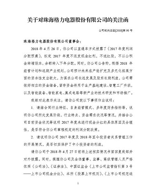 今日,格力电器收到深交所关注函,要求结合同行业特征、自身经营模式、多年度财务指标等,说明公司所处发展阶段、行业特点、资金需求状况等情况,并结合公司目前资金状况等说明2017年度未进行现金分红的具体原因及合理性,是否符合公司章程规定的利润分配政策。