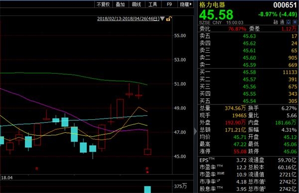 4月26日,“白马股”格力电器股价大跌8.97%,收报45.58元,一天内市值蒸发270.12亿元。