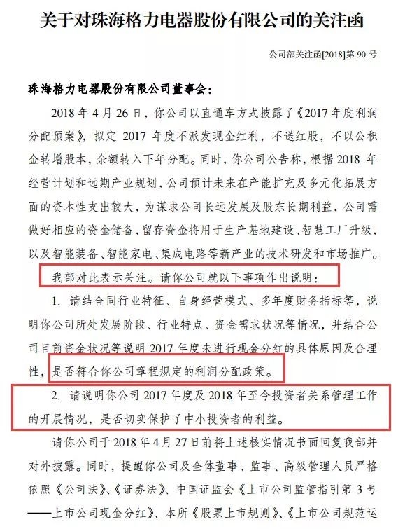 对此,深交所在今日上午也对格力电器下发了关注函,问题直指2017年度未进行现金分红的具体原因及合理性,以及是否切实保护了中小投资者的利益。