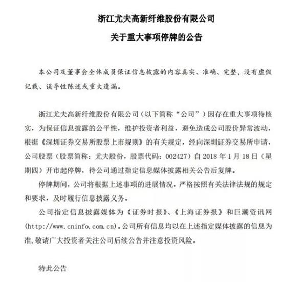 ST尤夫1月17日遭遇首个跌停,1月18日起开始停牌,公司公告称拟披露重大事项。