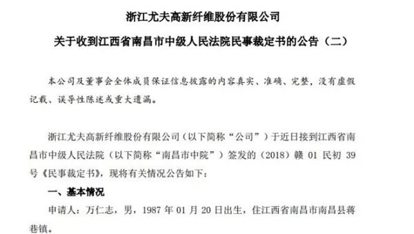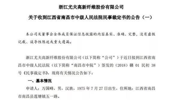 此后,1月26日,ST尤夫公告称,收到了江西省南昌市中级人民法院民事裁定书,公司卷入了2起民间借贷纠纷之中,同时还收到了深圳证券交易所中小板公司管理部的关注函。
