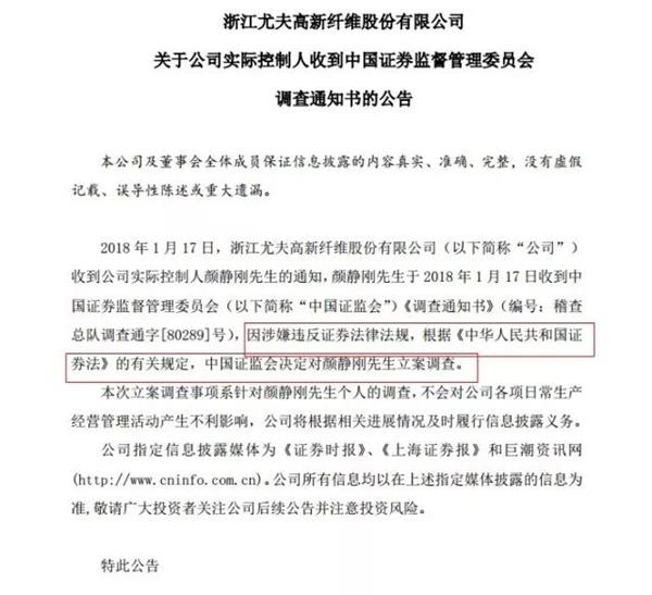 1月18日晚间,ST尤夫(当时还叫尤夫股份)发布公告——公司实际控制人颜静刚于1月17日收到中国证监会《调查通知书》,因涉嫌违反证券法律法规,中国证监会决定对颜静刚立案调查。