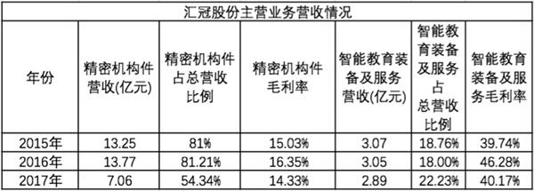 汇冠股份从2016年初开始进行战略聚焦,将业务重点转向教育领域。公司的主要业务板块,变更为精密制造和智能教育装备及服务。
