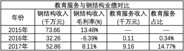 凯文教育2017年的钢结构收入约为5.29亿元,较去年同期增长63.83%;教育服务收入约为9162.18万元,较去年同期增长8203.76%。教育服务业务收入增幅巨大。