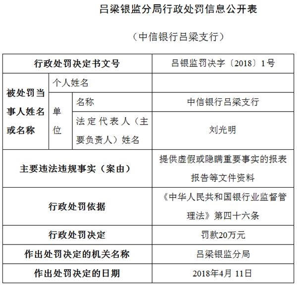 吕梁银监分局依据《中华人民共和国银行业监督管理法》第四十六条对中信银行吕梁支行罚款20万元。