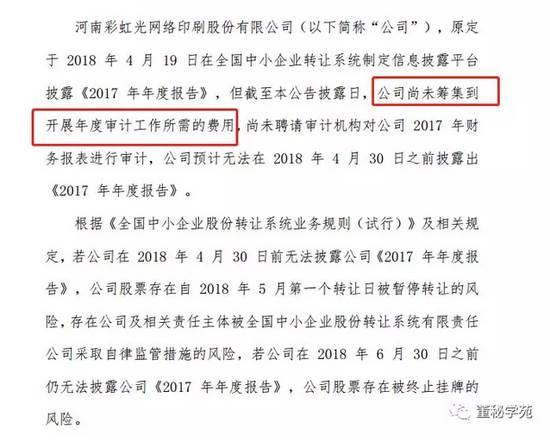 作为一家主板上市公司没有钱付审计费用,这的确是A股的奇闻,要知道2018年4月19日,新三板公司彩虹光(834226)公告称,因公司尚未筹集到审计费用,所以还未聘任审计机构,导致2017年年报不能按时披露时,市场是并不诧异的,毕竟是一家新三板公司,而现在同样的事情却发生在了主板上市公司身上。