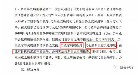 与此同时,大股东推荐了亚太所。由于公司无现金可用,两大股东均表示其愿意支付由其所推荐的审计机构的审计费。2018年3月14日,公司第九届董事会第二十次会议通过了《关于聘请亚太(集团)会计师事务所(特殊普通合伙)为公司2017年度报告审计机构的议案》。