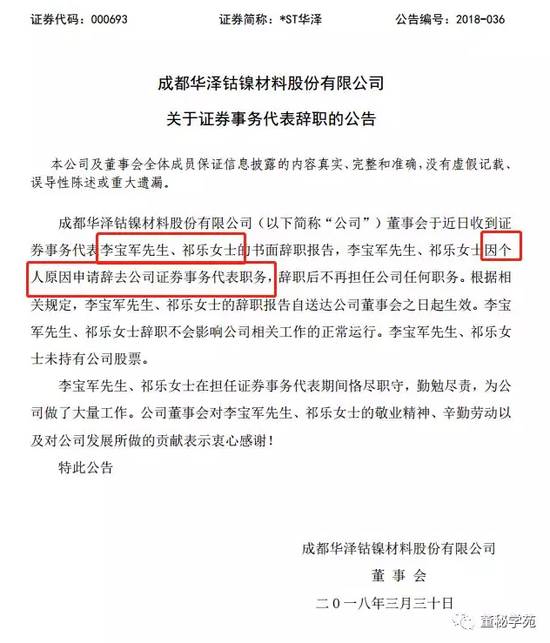 这期间还有个插曲,那就是*ST华泽的两个证代在3月30日一起走了,辞职时间正是公司四处筹钱的日子。