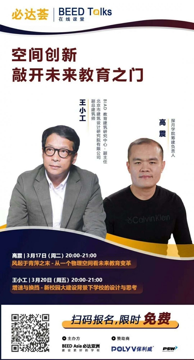 本期“必达荟 | BEED Talks”话题为:空间创新,敲开未来教育之门。我们有幸邀请到高震老师和王小工老师为大家带来分享。欢迎大家在周二(3月17日)、周五(3月20日)20:00入群观看。