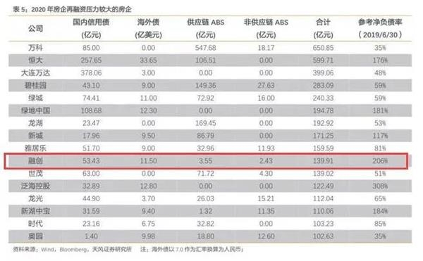 根据天风证券的研报显示,根据三季报,融创的净负债率高达206%,位列房地产业杠杆率前列。