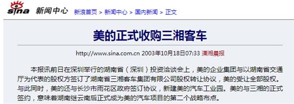 2003年,美的集团正式进军以客车为代表的商用汽车领域。2004年至2006年初,美的集团又先后收购云南客车厂、云南航天神州汽车有限公司及湖南省三湘客车集团有限公司三家企业。2005年9月和2006年8月,占地300亩的美的客车昆明新基地和占地255亩的美的客车长沙新基地先后建成投产,至此美的客车形成两大全新制造基地,具有万台客车整车和专用底盘制造能力。