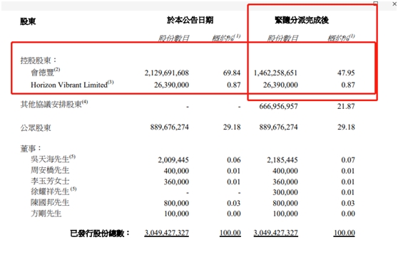 同理,根据九龙仓集团公告,在私有化之前,吴光正通过会德丰及Horizon Vibrant Limited间接持有九龙仓集团69.56%*69.84%+0.87%*0.471=48.99%股权,私有化之后吴光正直接持有48.82%股权,持股比例只减少了0.63%。