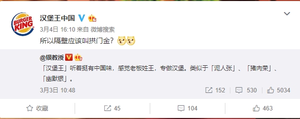 而就在今年3月,汉堡王中国的官网还曾转发一条评论认为“汉堡王”名字有中国味的微博,隔空@麦当劳,并称后者应该叫“拱门金”。