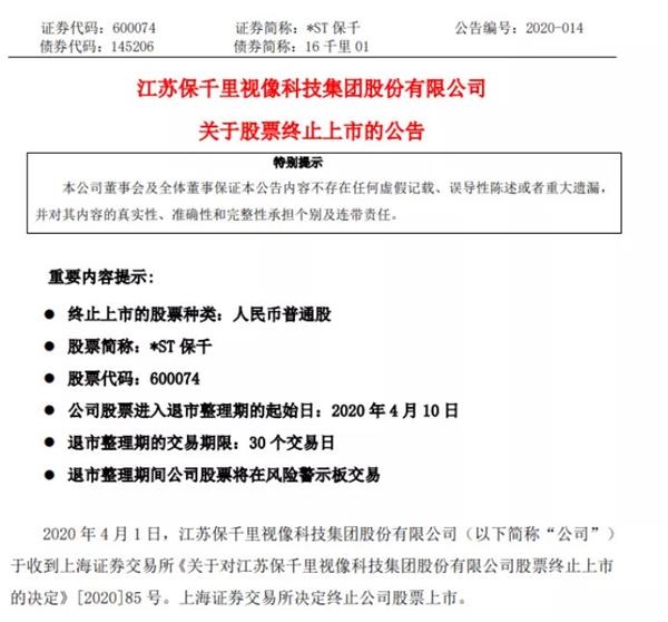 *ST保千(以下部分地方简称保千里)4月1日晚间公告称,公司收到上海证券交易所《关于对江苏保千里视像科技集团股份有限公司股票终止上市的决定》[2020]85号。上海证券交易所决定终止公司股票上市。