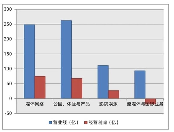 图1。 迪士尼的业务组成以及相应营业额和经营利润 (数据来源:迪士尼2019年10K)