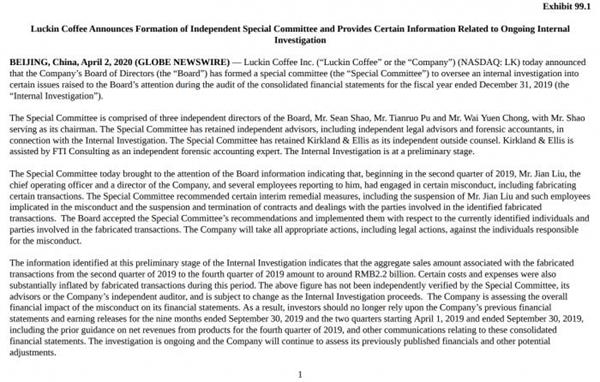 美国当地时间4月2日盘前,瑞幸咖啡提交监管文件显示,在审计截至2019年12月31日的年报发现问题后,董事会成立了一个特别调查委员会。