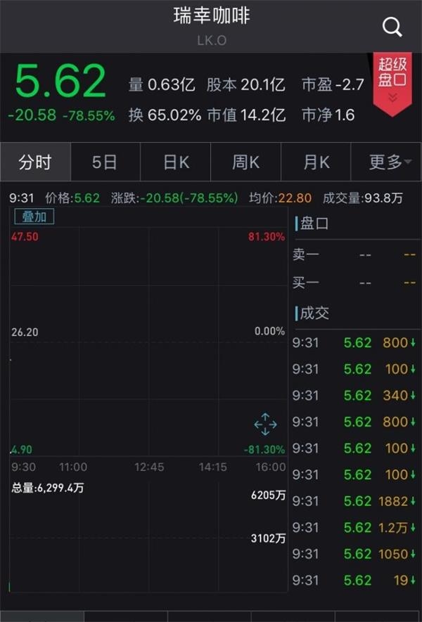 瑞幸咖啡盘前大幅跳水,跌逾80%。开盘不久,瑞幸咖啡便触发熔断,熔断前跌78.55%。