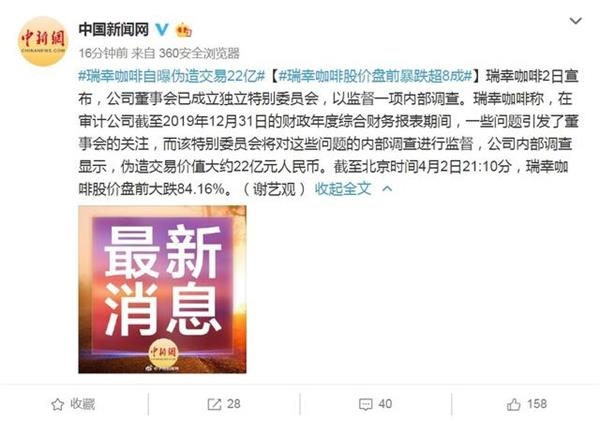 瑞幸咖啡2日宣布,公司董事会已成立独立特别委员会,以监督一项内部调查。瑞幸咖啡称,在审计公司截至2019年12月31日的财政年度综合财务报表期间,一些问题引发了董事会的关注,而该特别委员会将对这些问题的内部调查进行监督,公司内部调查显示,伪造交易价值大约22亿元人民币。受此影响,瑞幸咖啡股价盘前大跌84.16%。截至北京时间4月2日21:50分,瑞幸咖啡股价跌至8.09美元,大跌69.12%。