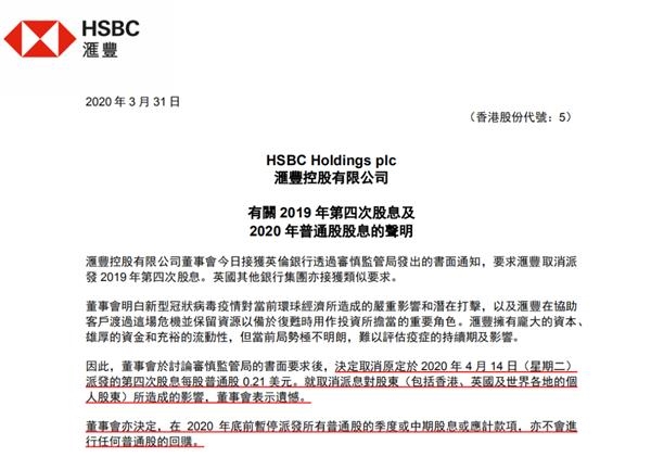 强烈号召之下,欧洲多家银行已进行响应。4月1日,汇丰控股发布公告称,董事会今日接获英伦银行透过审慎监管局发出的书面通知,要求汇丰取消派发2019年第四次股息。董事会于讨论审慎监管局的书面要求后,决定取消原定于2020年4月14日(星期二)派发的第四次股息每股普通股0.21美元。就取消派息对股东(包括香港、英国及世界各地的个人股东)所造成的影响,董事会表示遗憾。