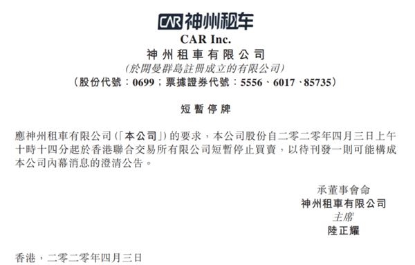 神州租车在港公告,短暂停牌,等待发布澄清公告。