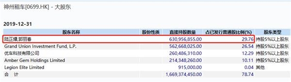 神州租车2019年年报显示,陆正耀和郭丽春共计直接持股占比达29.76%。