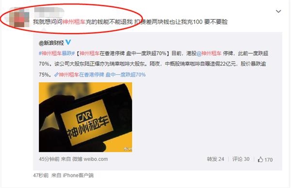 有消费者可能因此对神州租车表示担忧,想要把充值的钱退回来。
