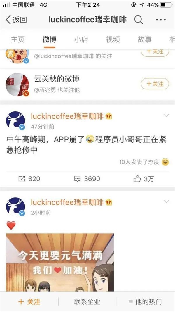 当日午后,瑞幸咖啡通过官微回复,“中午高峰期,APP崩了,程序员小哥哥正在紧急抢修中。”