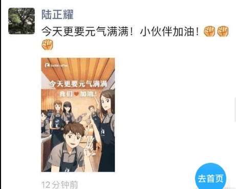 瑞幸高管团队更是集体在朋友圈转发一张宣传图,董事长陆正耀喊出口号:“今天更要元气满满!小伙伴加油!”