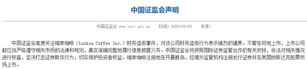 午后,中国证监会发表声明,高度关注瑞幸咖啡(Luckin Coffee Inc。)财务造假事件,对该公司财务造假行为表示强烈的谴责。