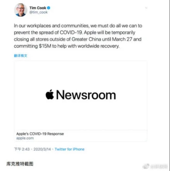 3月14日,苹果公司宣布于3月27日前关闭大中华区以外所有Apple Store零售店。在该截止日期前仍未提货的苹果用户,需要等到Apple Store重新开业才可以提货。当天,苹果CEO库克也在推特上发布了全球门店关闭的消息。