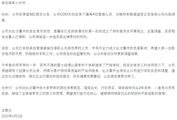 面对此次事件掀起的舆论风暴,瑞幸咖啡在北京时间4月2日晚间发布了一封内部信,表示相关当事人已停职,公司已安排其他管理者接任停职人员原负责的工作,并保留进一步追究其法律责任的权利。