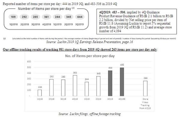 该报告称,瑞幸咖啡在2019年第三和第四季度分别至少夸大了每家门店每天69%和88%的商品销量;且其实际销售价格仅为上市价格的46%,而不是管理层声称的55%;此外,瑞幸咖啡还夸大了150%的2019年第三季度的广告支出,尤其是在分众传媒上的支出,瑞幸有可能将其被夸大的广告费用重新用于增加收入和店面利润。